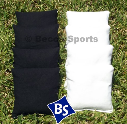 Eight quality cornhole bean bags 4 black and 4 white We make our bags to last Our bags are made out of 12 oz duck cloth and are stitched to last The 6x6 bags are filled with whole feed corn and weigh 16 oz 1 lb Becca Sports offers a one year guarantee on all of their bags see policies for Read More..